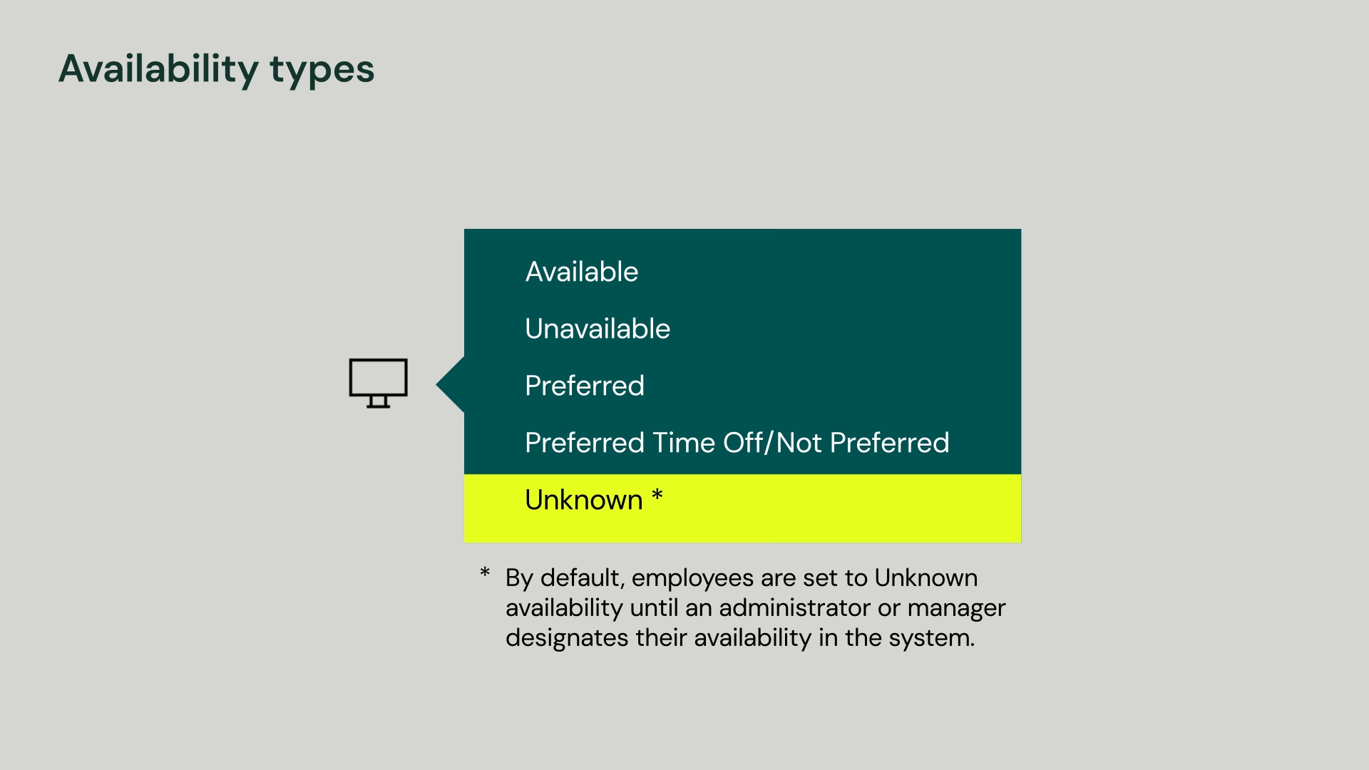 Availability helps managers track and view when employees can or cannot work while creating or maintaining schedules. Managers can define an employee's availability for each day of the week or for different times of the day.